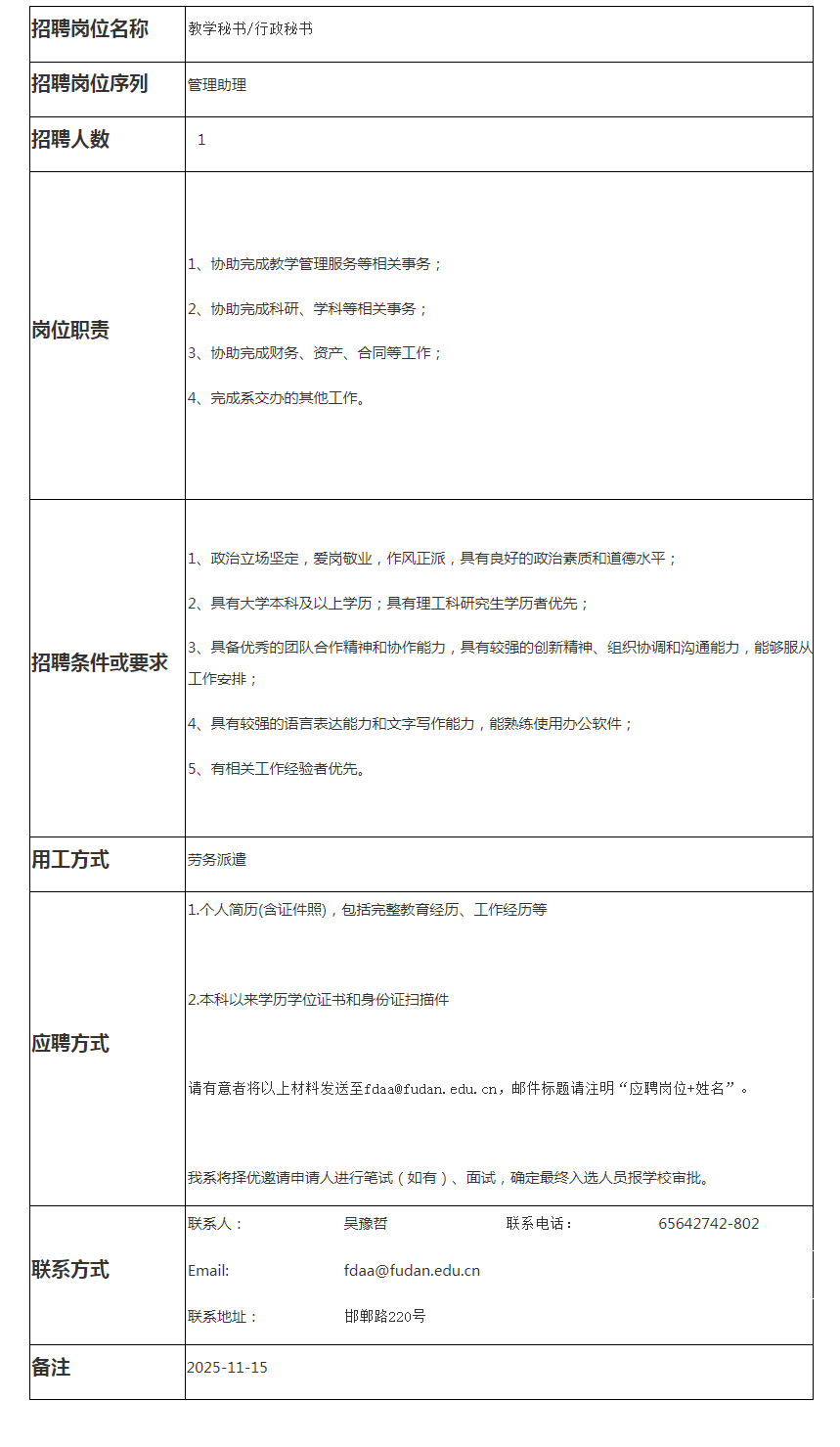 复旦大学航空航天系招聘教学秘书/行政秘书岗位1名正文